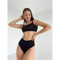 Стильний купальник з високими трусиками. Завдяки тісному переплетінню волокон матеріалу, купальник майже неможливо порвати, а через пори тканини проходить повітря, тому шкіра може дихати. Тканина відмінно відштовхує вологу і швидко сохне. Також на ній майже не залишається слідів бруду. Купальник не втрачає форму, не просвічує та приємний до тіла.
