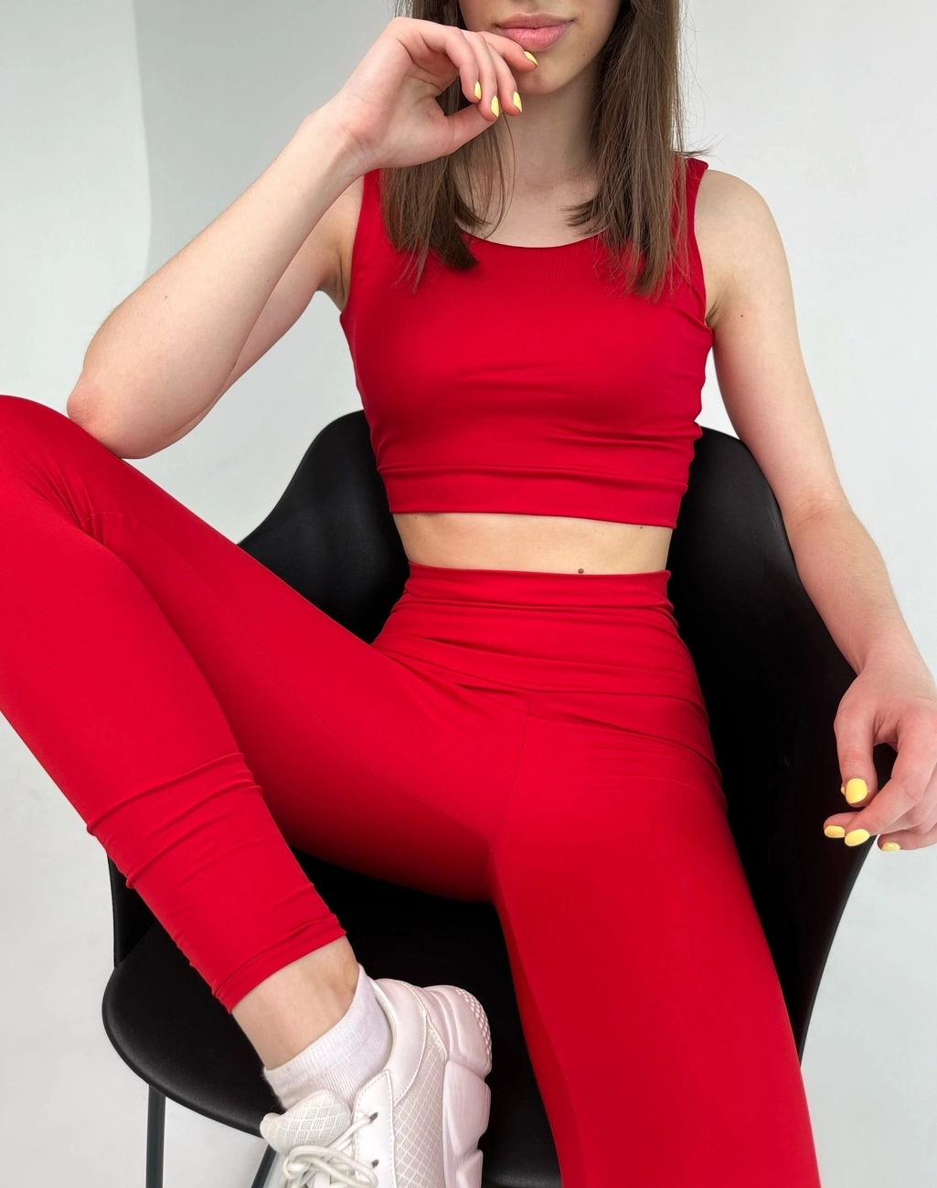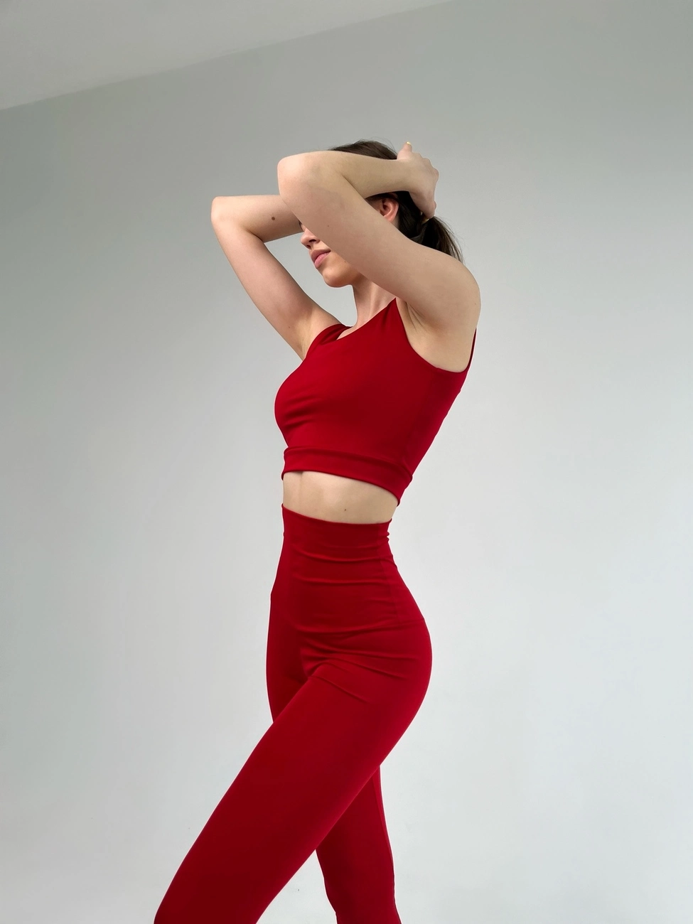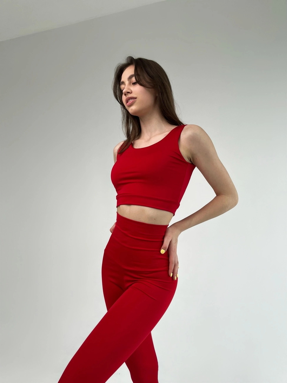 Топ-майка червоного кольору. Завдяки тісному переплетінню волокон матеріалу, топ майже неможливо порвати, а через пори тканини проходить повітря, тому шкіра може дихати. В ньому можна спокійно займатися спортом, адже тканина відштовхує не лише вологу, а й бруд - вони завжди виглядають, наче тільки-но вдягнуті! Через високу водовідштовхувальну властивість матеріалу, на ньому не залишається слідів поту.
